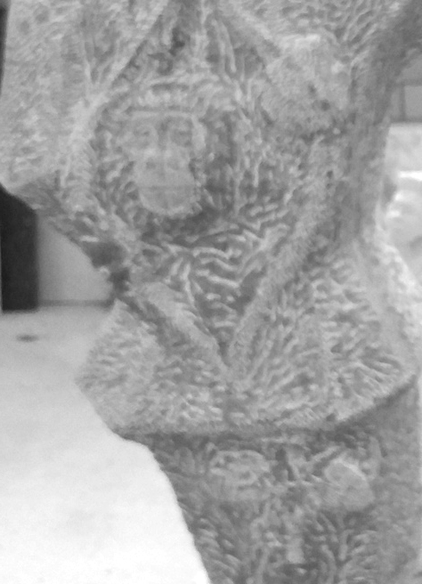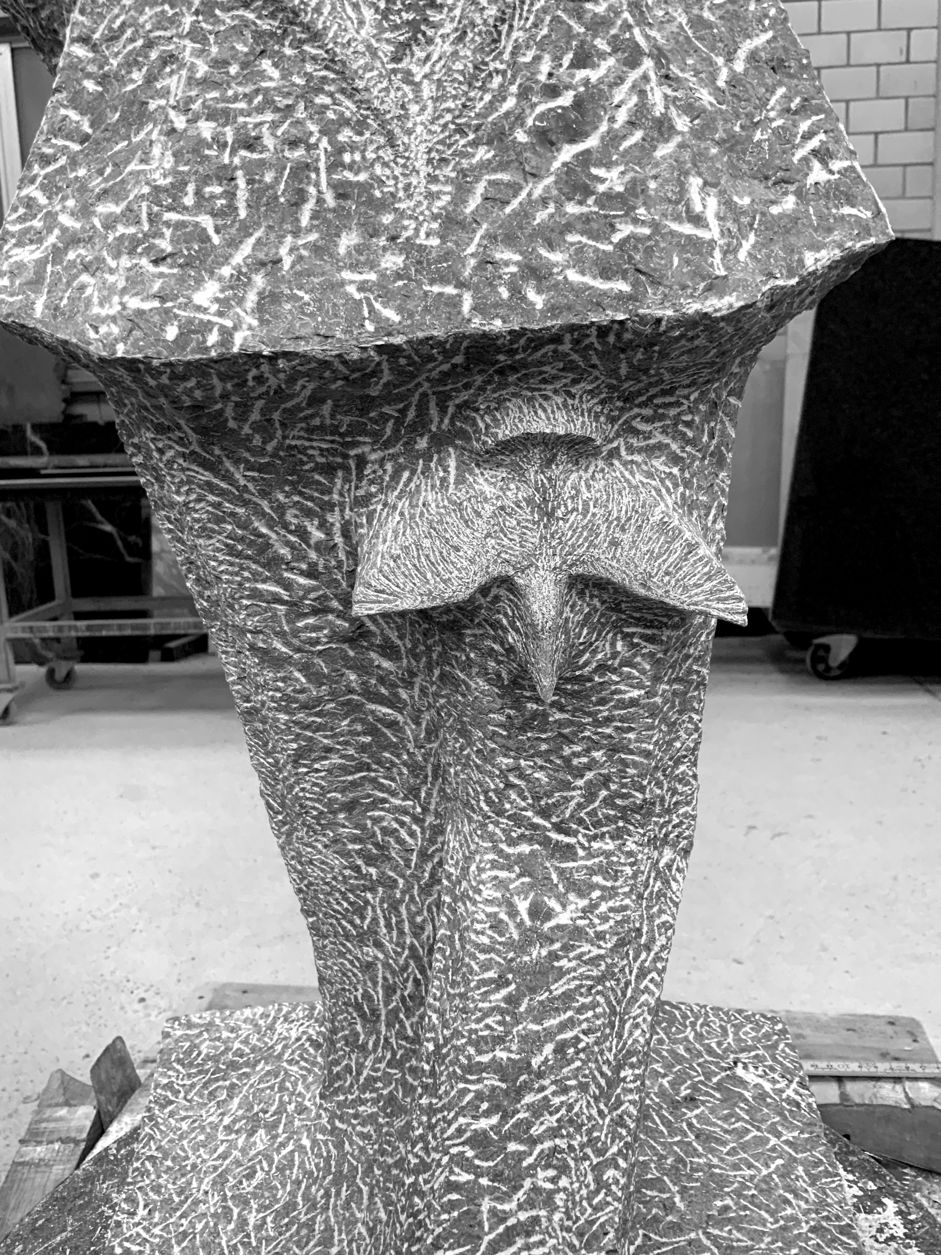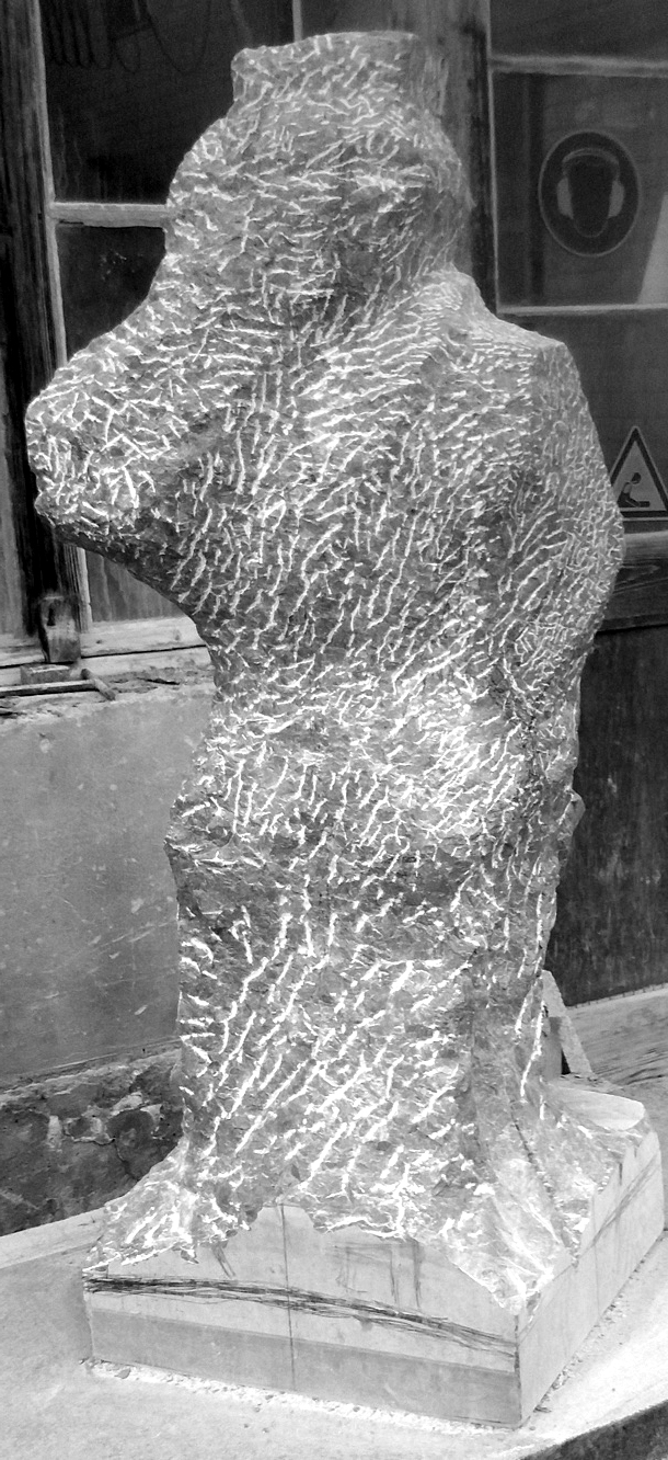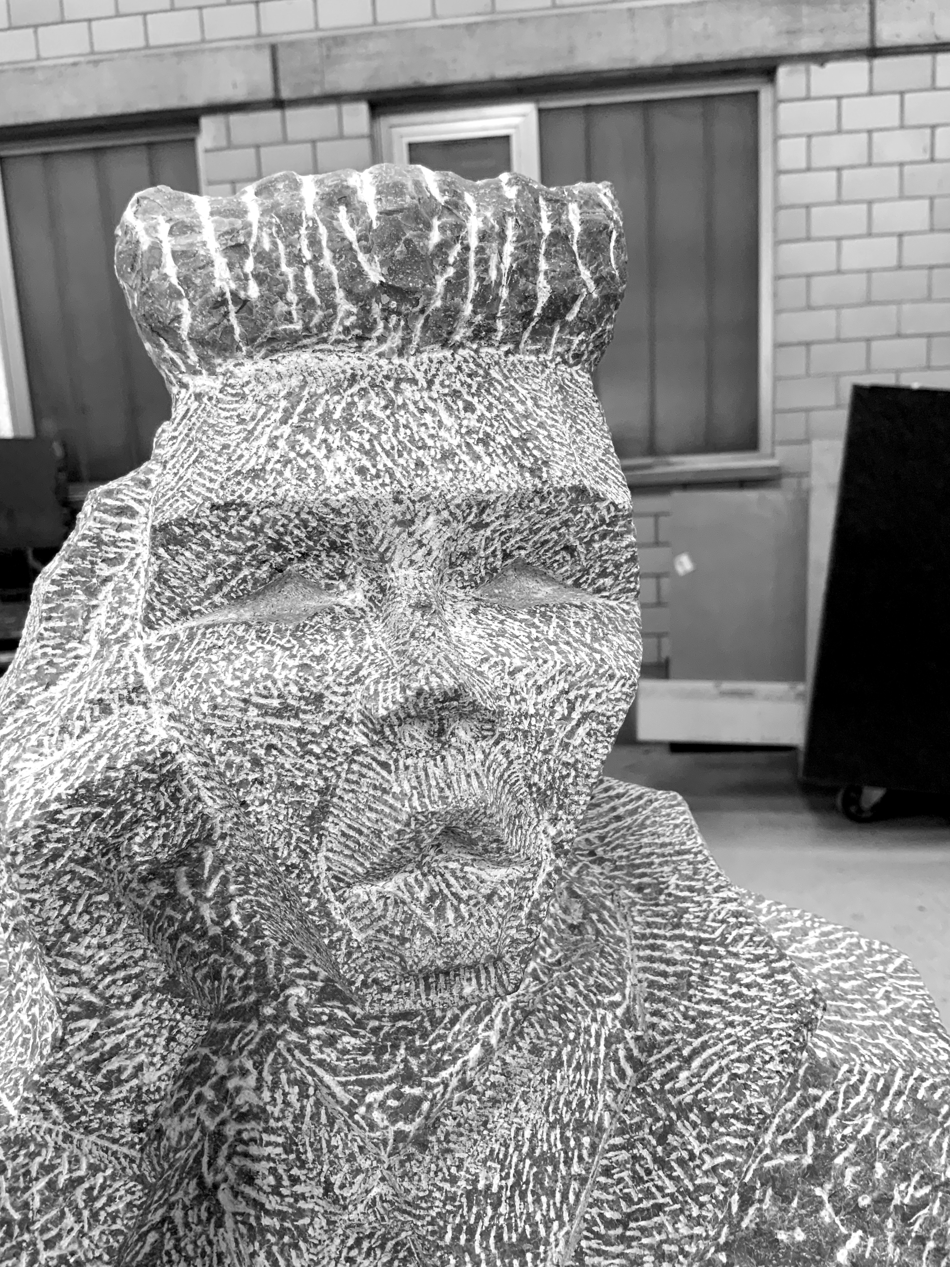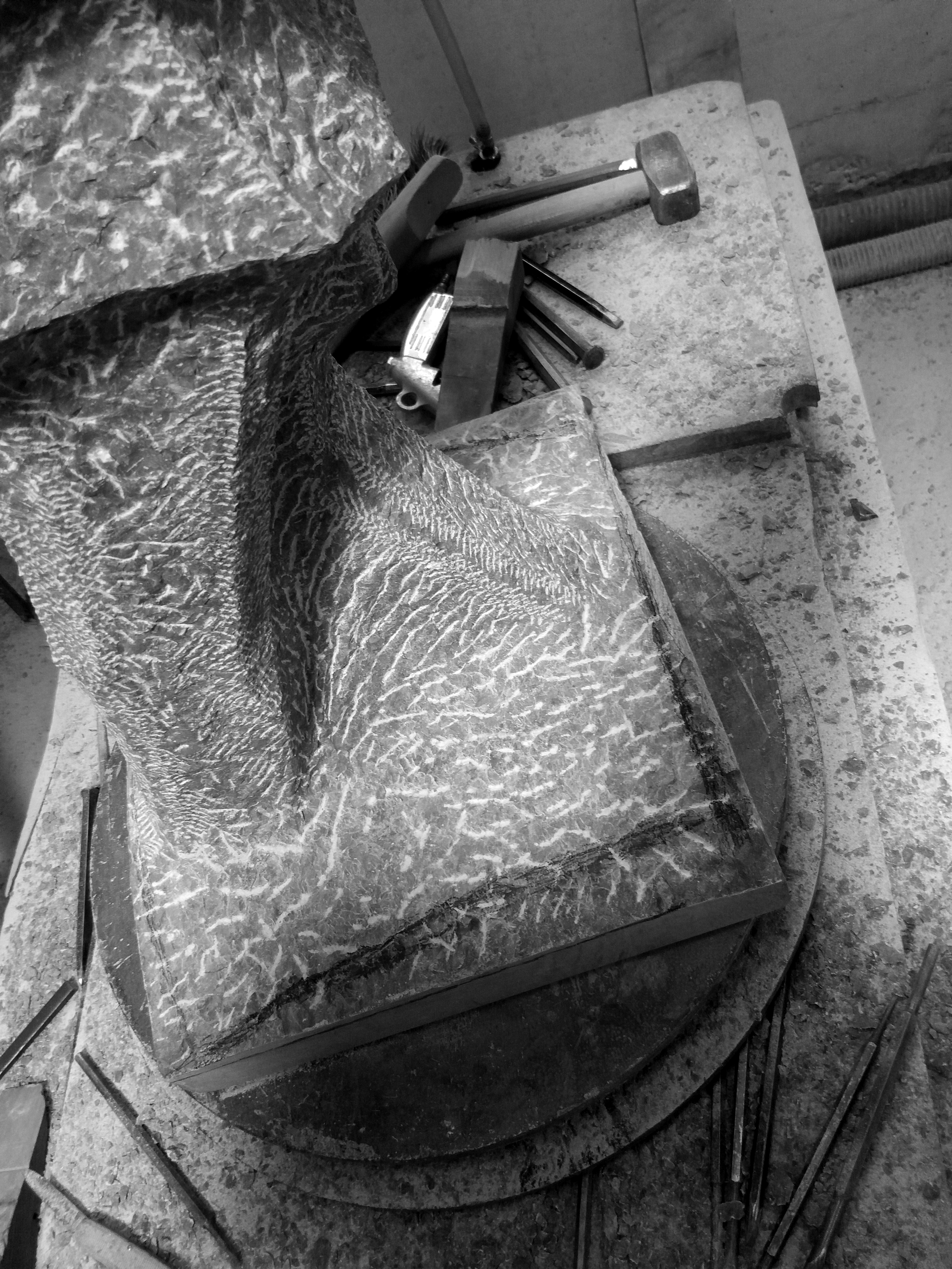 gleich bearbeitet, wie die gesamte Figur, mit Spitzeisen, Zahneisen und Setzer.