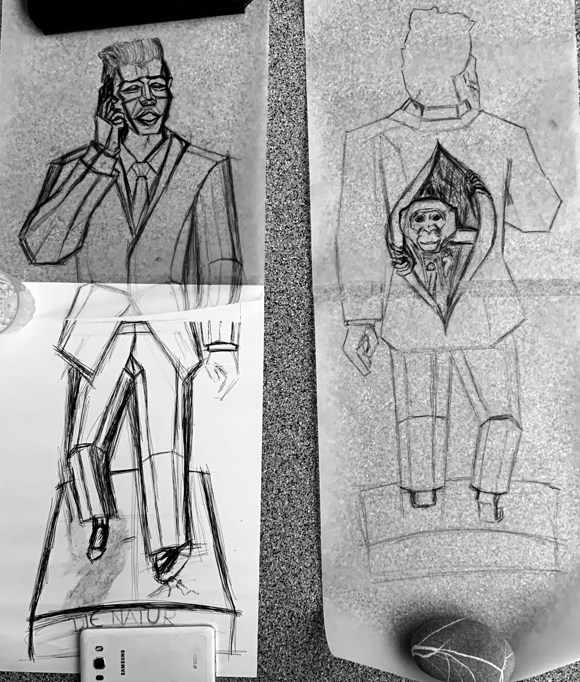 Hier sehen sie Kopf und Handy+Hand Skizzen. Es ging dabei um die Frage, wie diese rustikal und